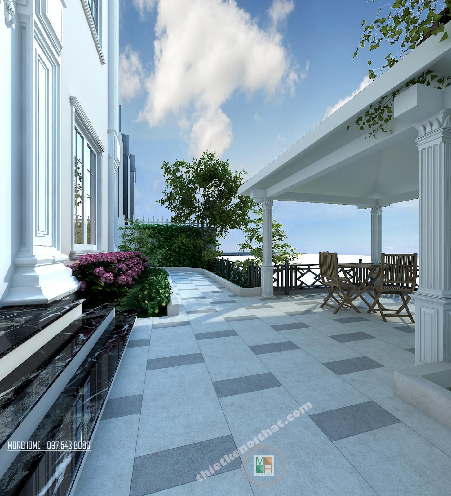 Không gian bên ngoài giáp với con kênh đào tại Vinhomes Riverside được thiết kế bởi Nội thất Morehome.