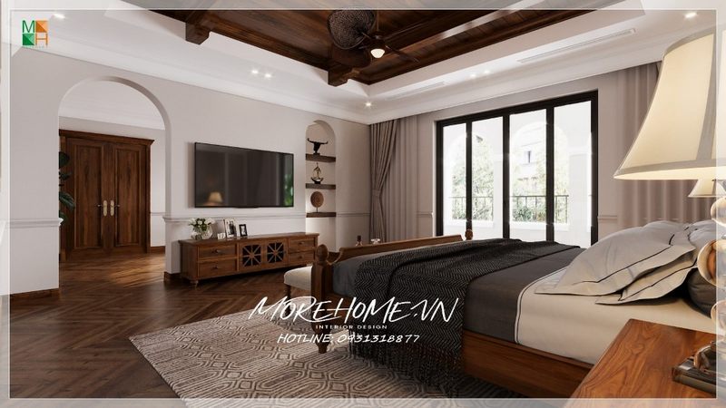 Thiết kế phòng ngủ master có diện tích lớn cho biệt thự, với nội thất bằng gỗ óc chó phong cách tân cổ điển sang trọng cao cấp