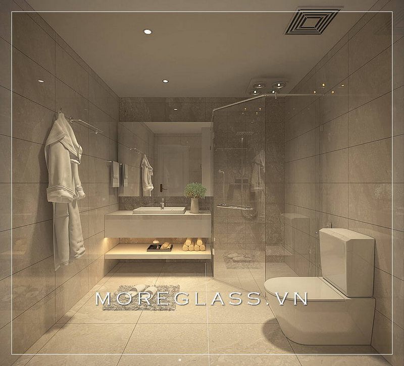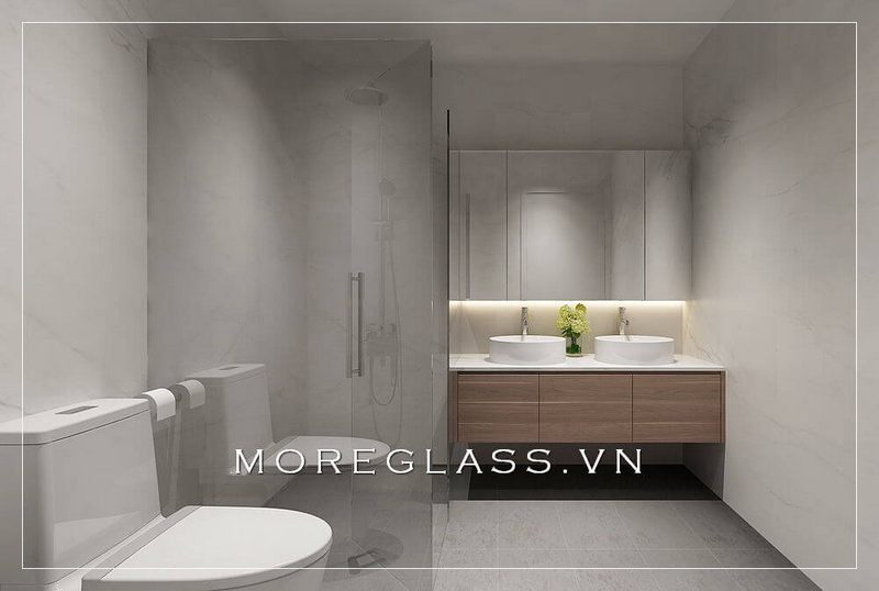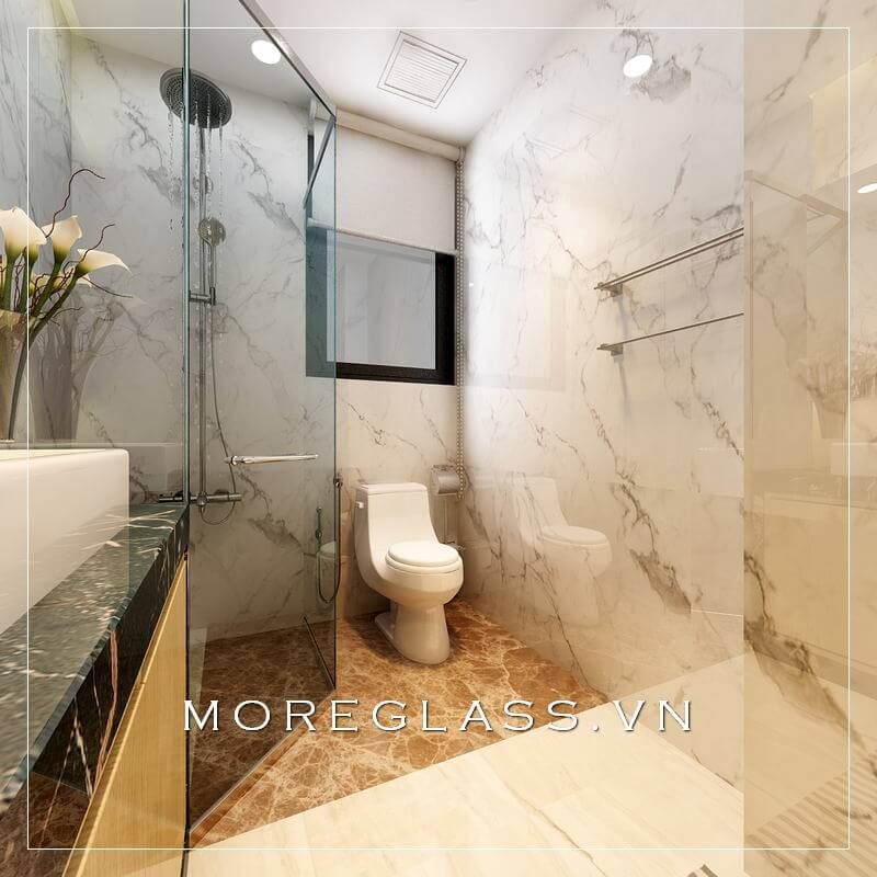 Mẫu thiết kế nhà tắm kính đẹp, nhỏ gọn với nội thất đơn giản cùng thiết bị vệ sinh hiện đại, tinh tế tạo không gian thông thoáng hơn.