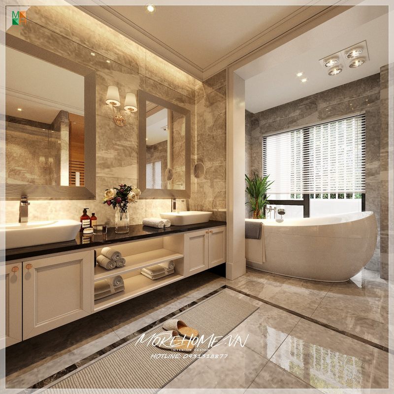 Không gian phòng tắm được trang trí đẹp mắt với bồn tắm cao cấp cung cấp sự tiện nghi sang trọng, thẩm mỹ thư giãn và được nhiều gia đình yêu thích và trở thành xu hướng.