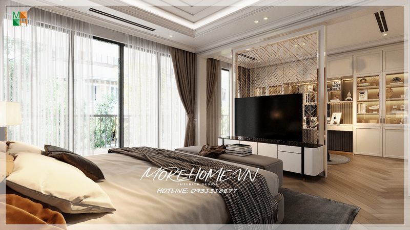 Không gian nghỉ ngơi của gia chủ được trang trí bằng nội thất phòng ngủ Master phong cách tân cổ điển sang trọng và ấn tượng, bao gồm các món đồ gỗ tự nhiên màu trắng, sàn gỗ màu nâu trầm mang đến cảm giác ấm áp.
