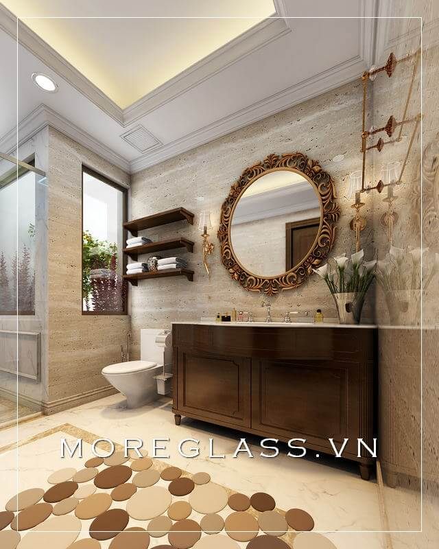 Mẫu kệ tủ gỗ tự nhiên hiện đai kết hợp gương tròn trang trí mang vẻ đẹp sang trọng cho không gian phòng tắm biệt thự