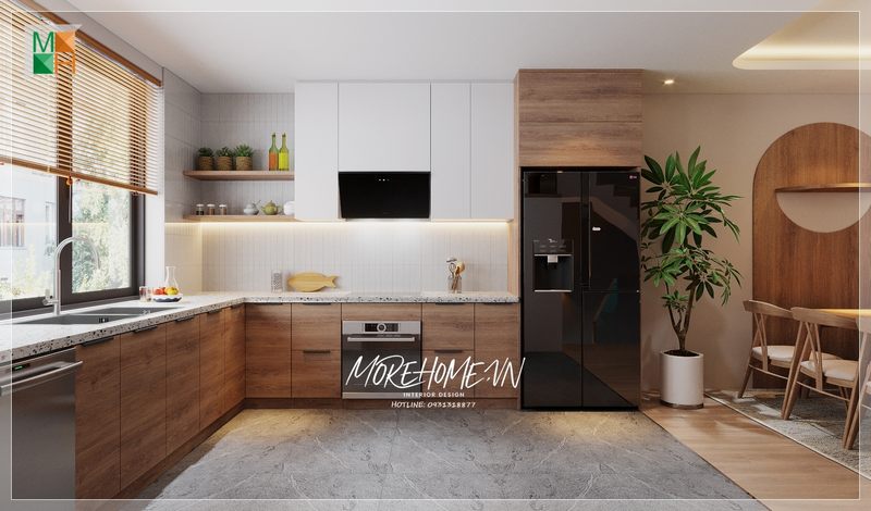 Tủ bếp gỗ tự nhiên với mặt đá hiện đại cung cấp sự hỗ trợ hiệu quả trong quá trình nấu nướng bằng cách cung cấp những ngăn bếp để lưu trữ đồ đạc và nắp gọn gàng.